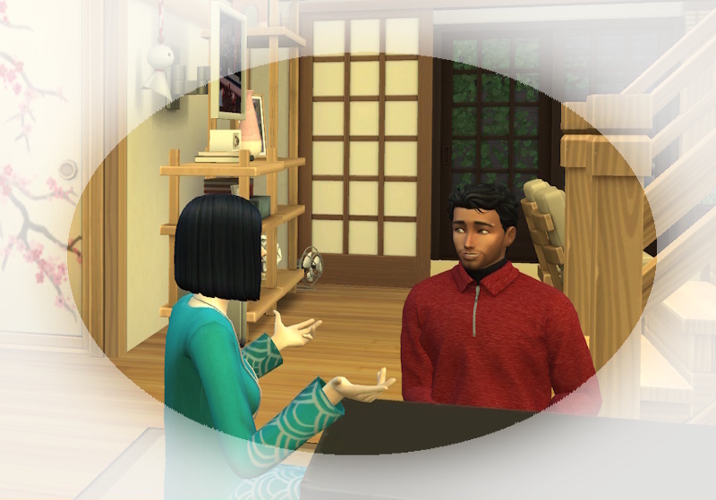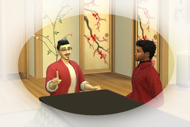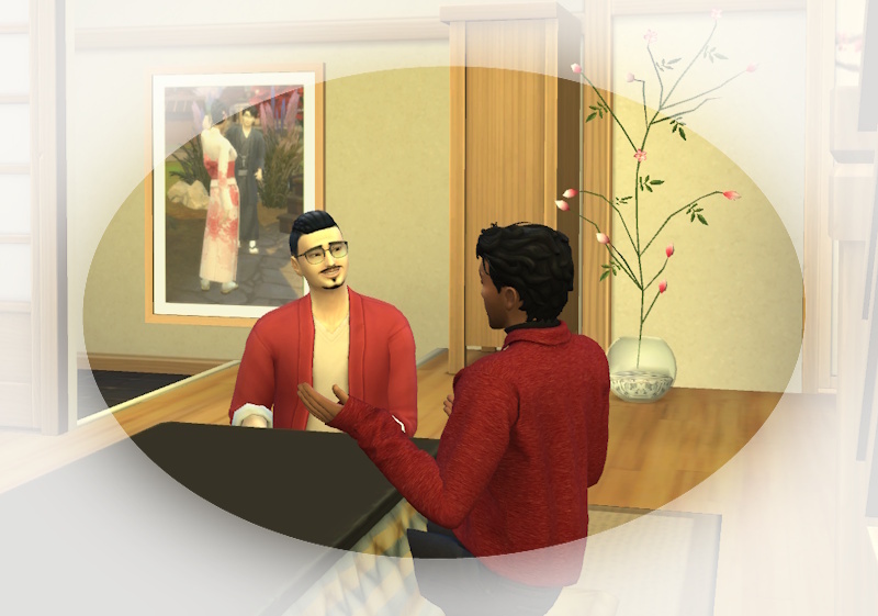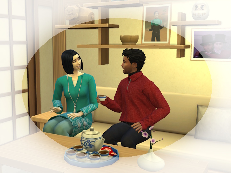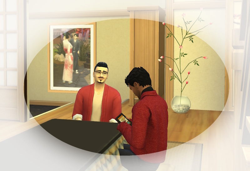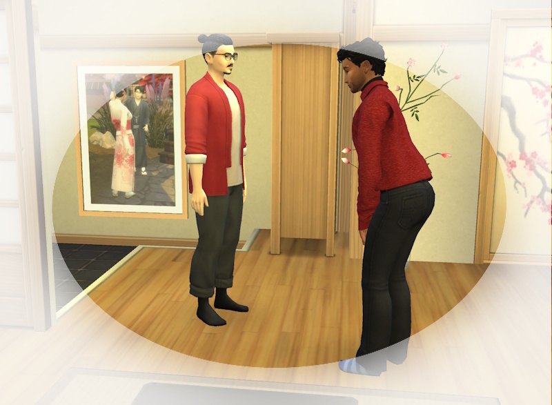 Snuggles: Er, ganz in schwarz, sie in einem rosa Kimono mit Blumendruck?